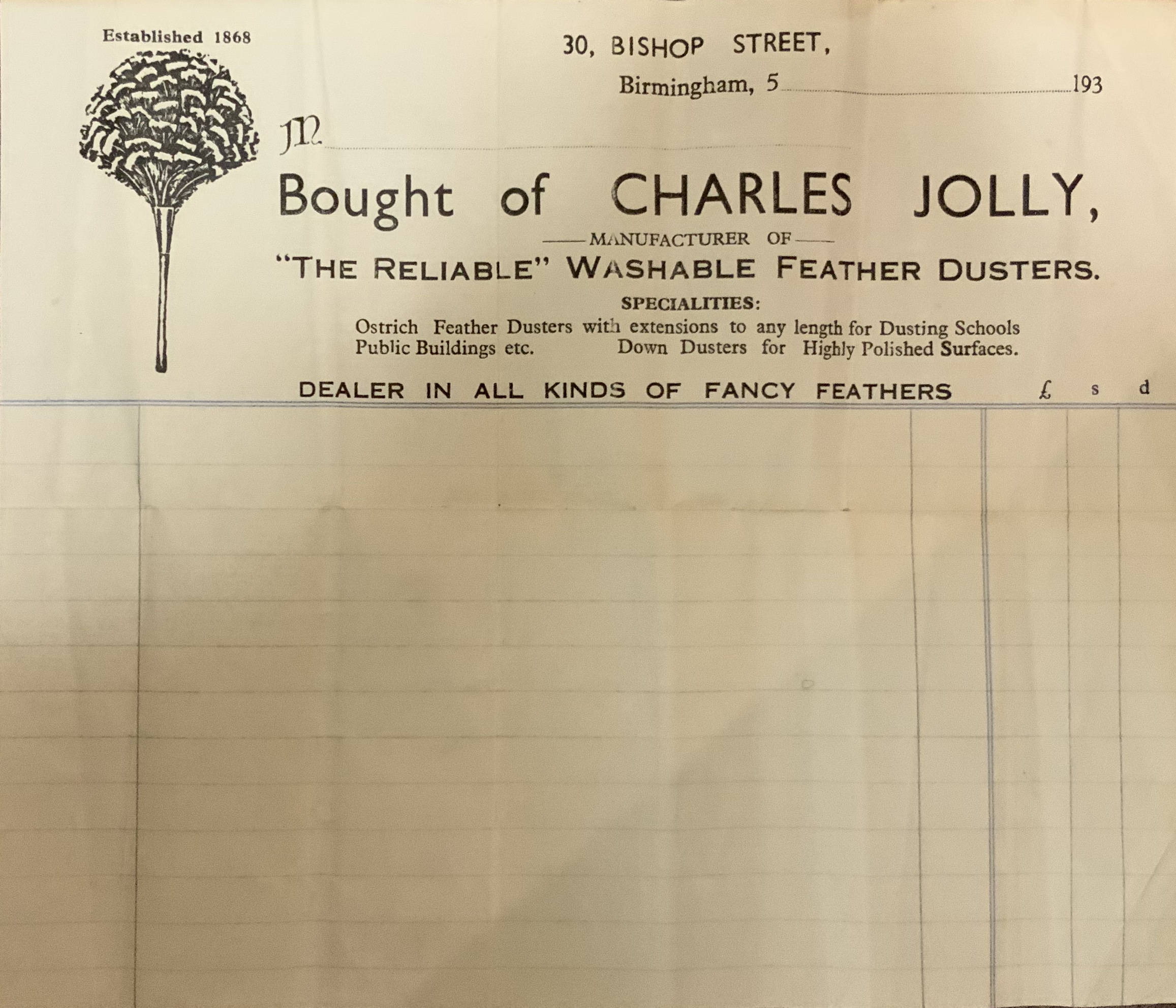 Although Charles died in 1909 his name still appeared on the headings of bills of sale in the 1930s, see adjacent bill of sale.  This shows that the business was established in 1868 was still going in the 1930s under the brand name “The Reliable”, with ostrich feather dusters as their speciality.